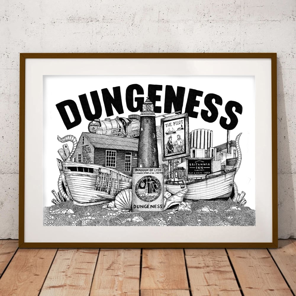 Hand drawn in fineliner pen, it features the lighthouse, boats, the sign, Prospect Cottage, the power station, a train from the Romney Hythe and Dymchurch Railway and the signs for The Pilot and The Britannia.