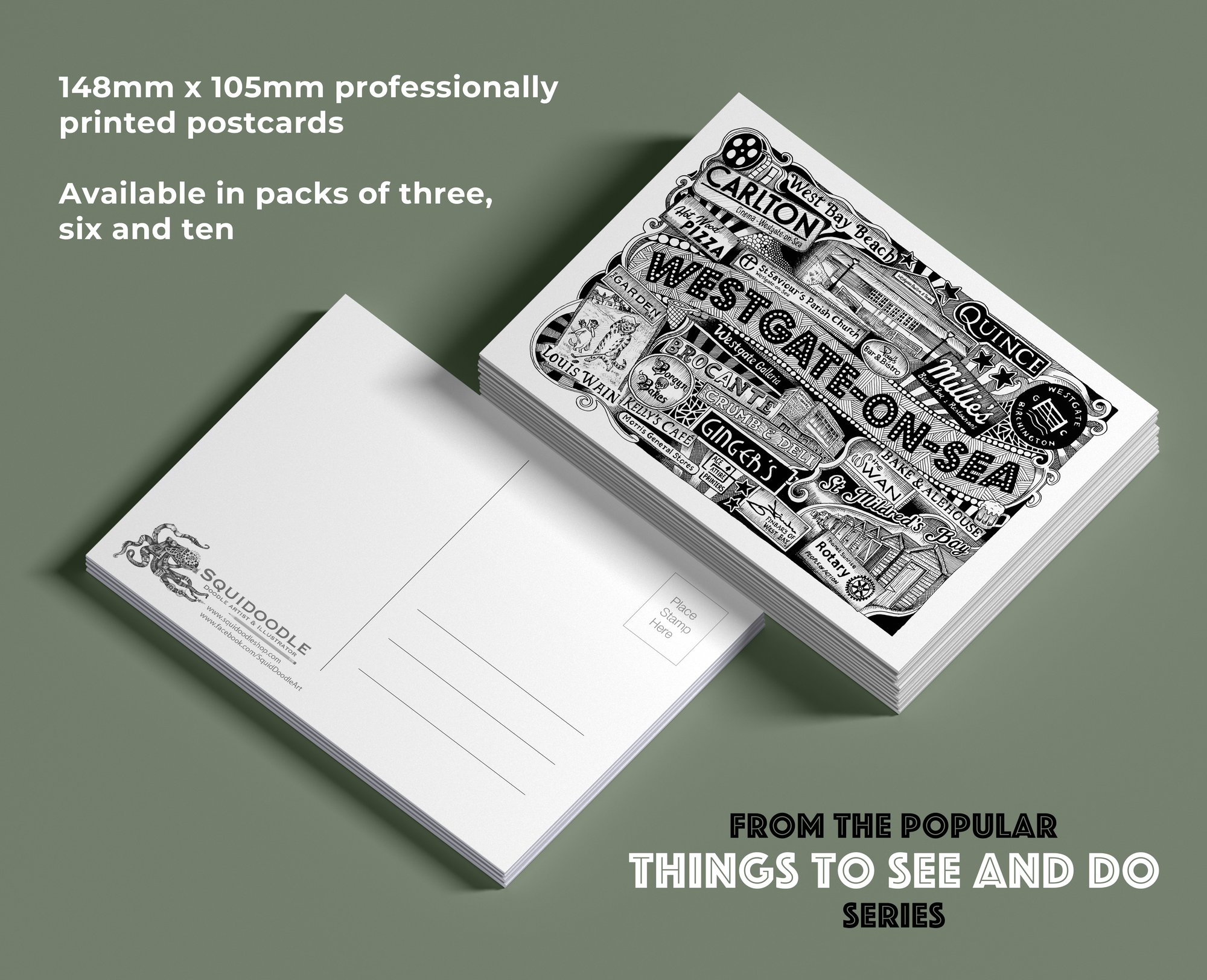 Available for the first time - high quality postcards of my recent typographical drawing of Westgate on Sea landmarks, sights and attractions.